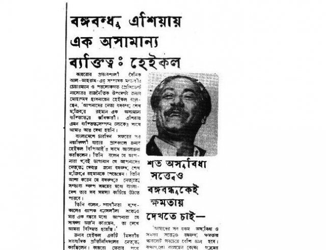 কায়রোর প্রভাবশালী ‘দৈনিক আল আহরাম পত্রিকার’ সম্পাদকমণ্ডলীর চেয়ারম্যান পরলোকগত প্রেসিডেন্ট নাসের এর রাজনৈতিক উপদেষ্টা মুহাম্মদ হাসনাইন হেইকল এসেছিলেন বাংলাদেশ সফরে। তিনি বাংলাদেশের প্রধানমন্ত্রী জাতির জনক বঙ্গবন্ধু শেখ মুজিবুর রহমানের সঙ্গেও সাক্ষাৎ করেন। উপমহাদেশের দেশগুলোর পারস্পরিক সম্পর্ক নিয়ে তাদের মধ্যে আলাপ হয়। বাংলাদেশ থেকে তিনি কায়রো ফেরার পথে ভারত ও পাকিস্তানও সফর করেছিলেন।