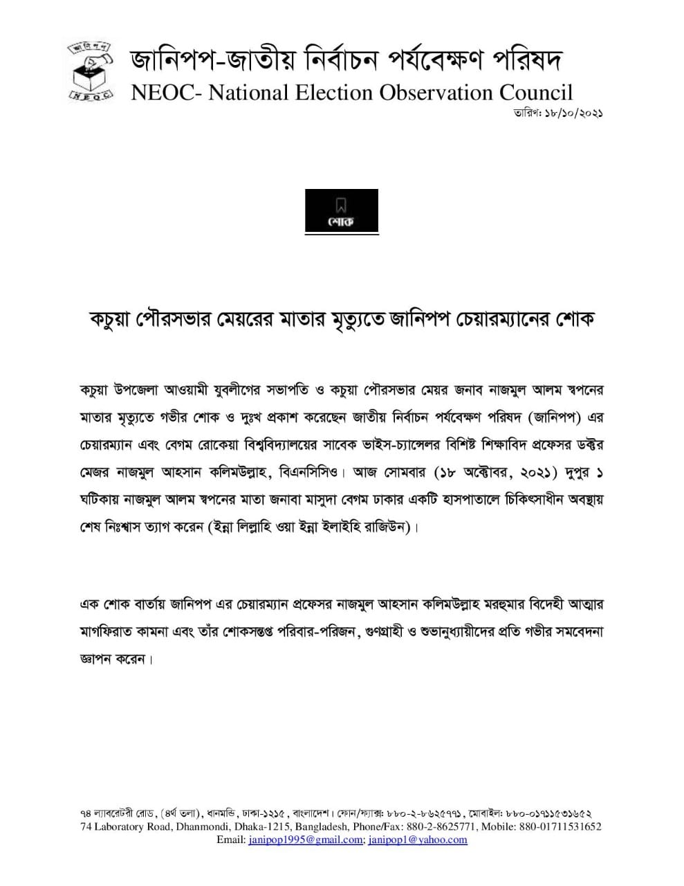 জানিপপ-এর প্রতিষ্ঠাতা চেয়ারম্যান প্রফেসর ডক্টর মেজর নাজমুল আহসান কলিমউল্লাহ, বিএনসিসিও